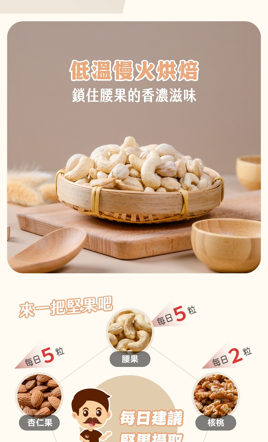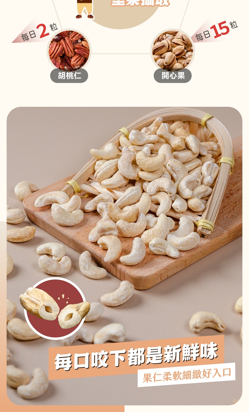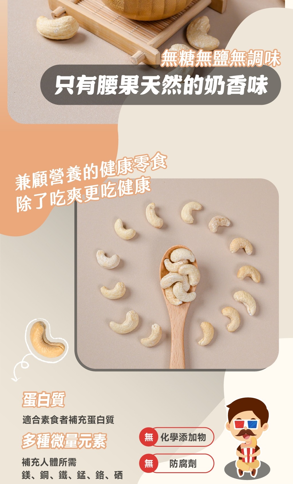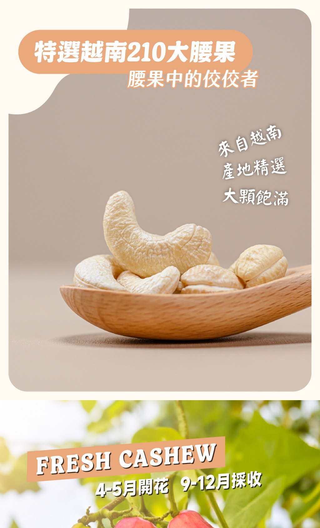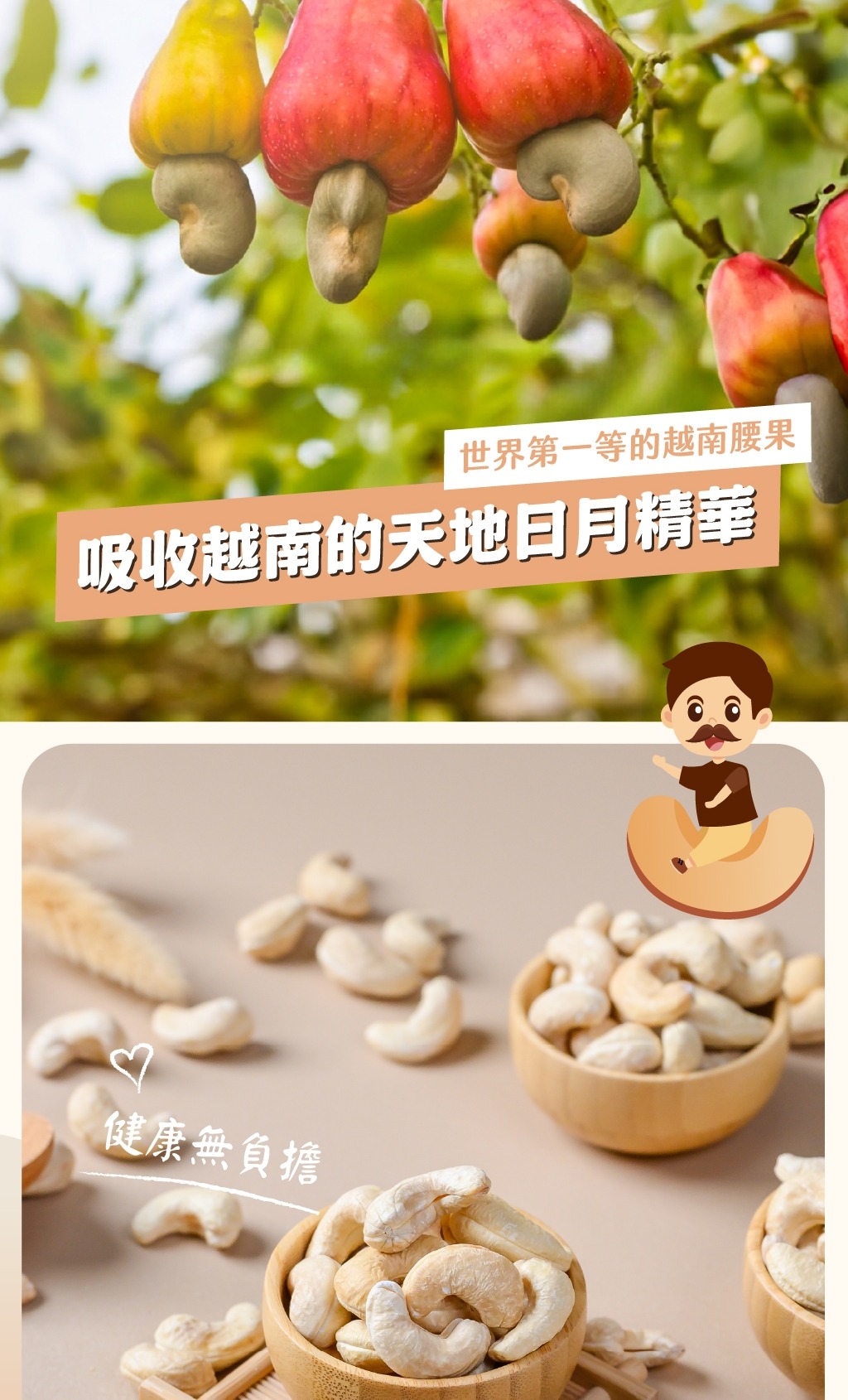 ✓ 特選大顆飽滿W210腰果, 口感香酥鬆脆 ✓ 低溫烘焙保留腰果最天然的香氣 ✓ 輕鬆補充腰果多種營養素 ✓ 來自腰果的故鄉越南 ✓ 成份單純無鹽無糖無調味 ✓ 富含蛋白質, 適合素食者補充蛋白質 ✓ 天天吃腰果對身體好處多多 ✓ 腰果果實較軟好入口