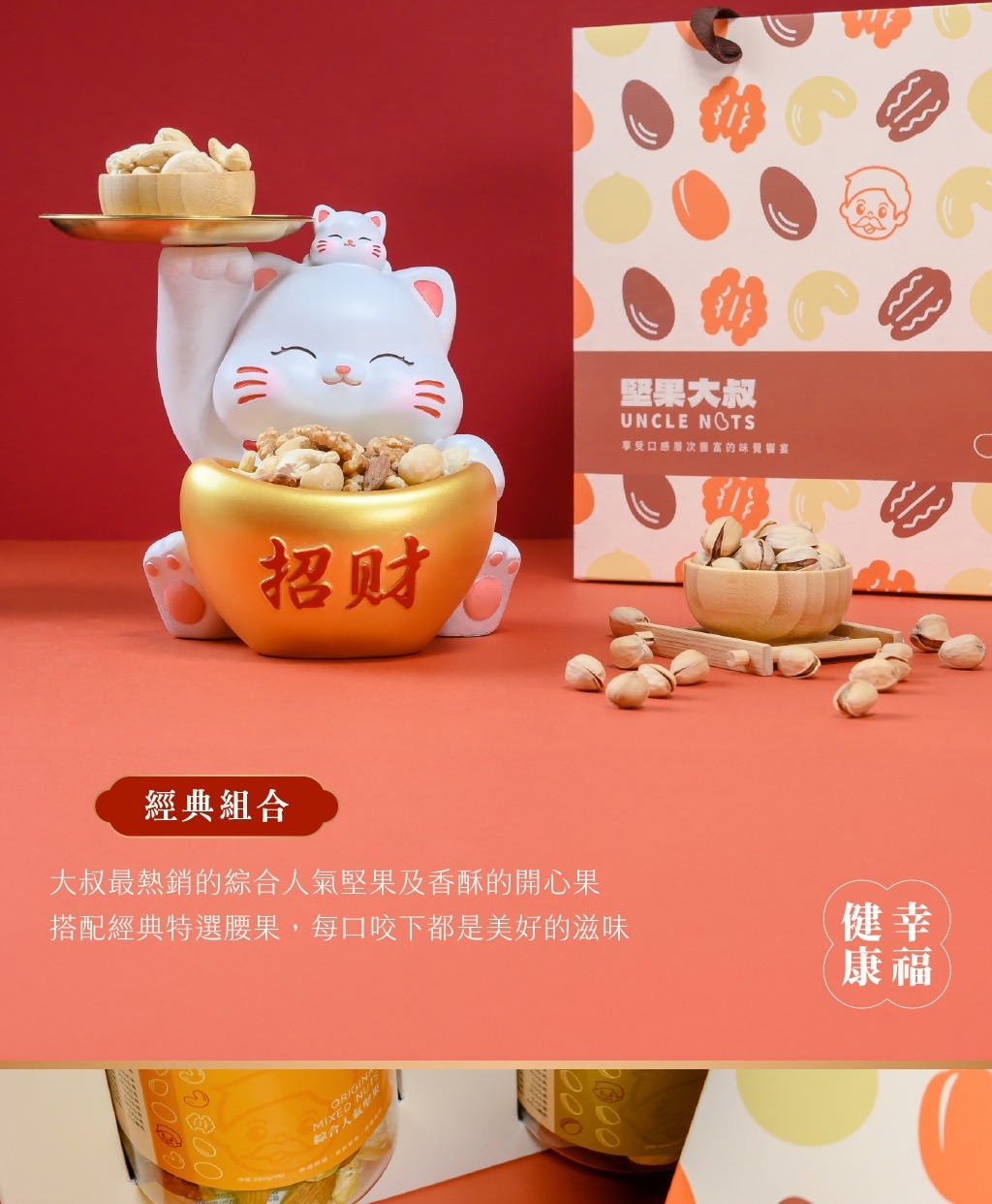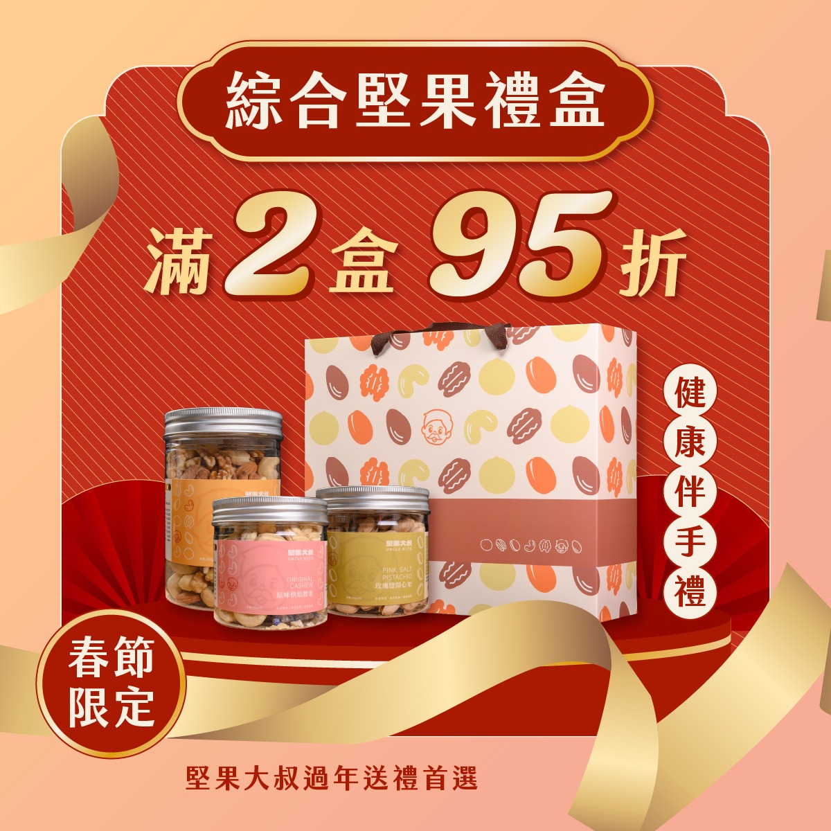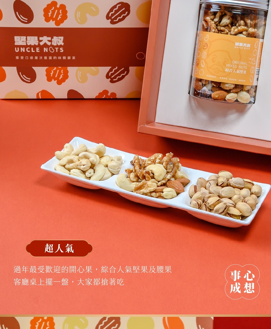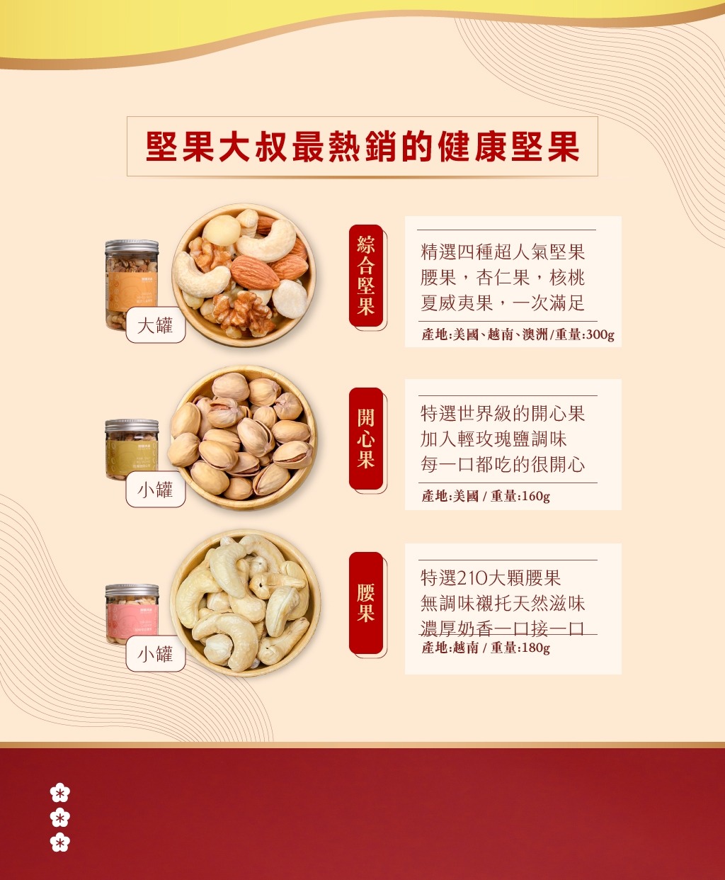 綜合人氣堅果(大罐):核桃仁、杏仁果、夏威夷果、腰果,多種堅果一次滿足 原味烘焙腰果(小罐):自然奶香濃郁、口感溫潤順口 玫瑰鹽開心果(小罐):微鹹提味,越吃越香,口感層次分明