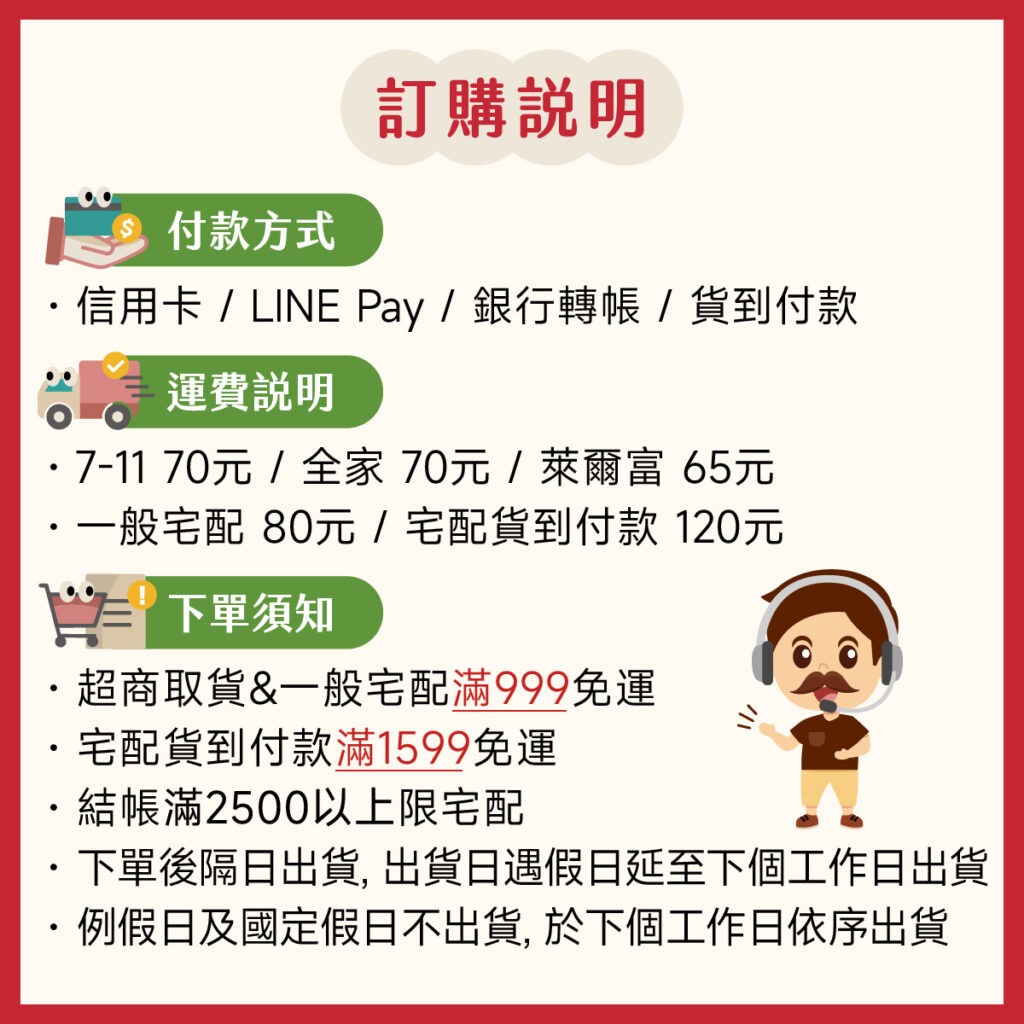下單須知 超商取貨滿 999 免運宅配到家滿 1799 免運結帳滿 3000 以上請選宅配寄送超商取貨付款僅限7-11當日下午3點前下單當日寄出例假日不出貨, 順延至上班日出貨有退換貨需求請與LINE小幫手聯絡