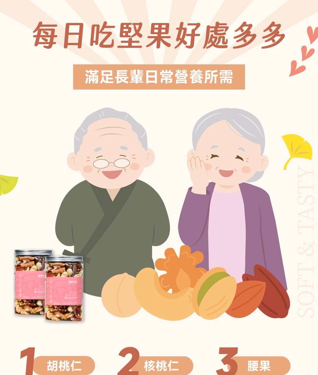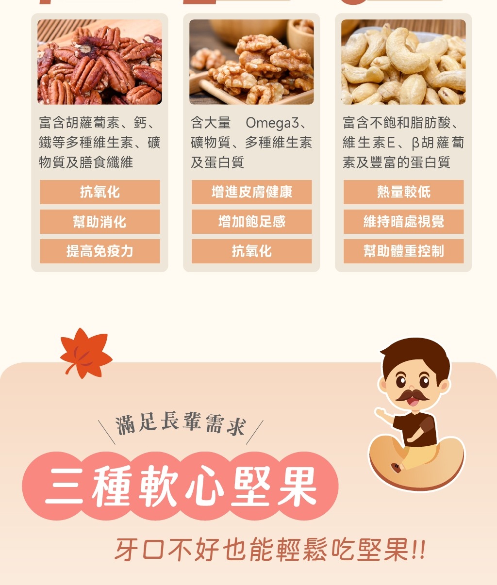 ✓ 專為長輩設計的軟心綜合堅果配方✓ 嚴選核桃仁、胡桃仁、腰果,口感柔軟不乾硬✓ 軟化處理,好咬好入口,長輩也能安心享用✓ 不用擔心牙口問題,輕鬆補充堅果營養✓ 成份單純無化學添加物,天天吃也無負擔✓ 一天一把,補充堅果中的好油脂與營養素✓ 低溫烘焙+軟心製程,保留堅果原始香氣✓ 吃得到香氣、吃得下去,更吃得安心