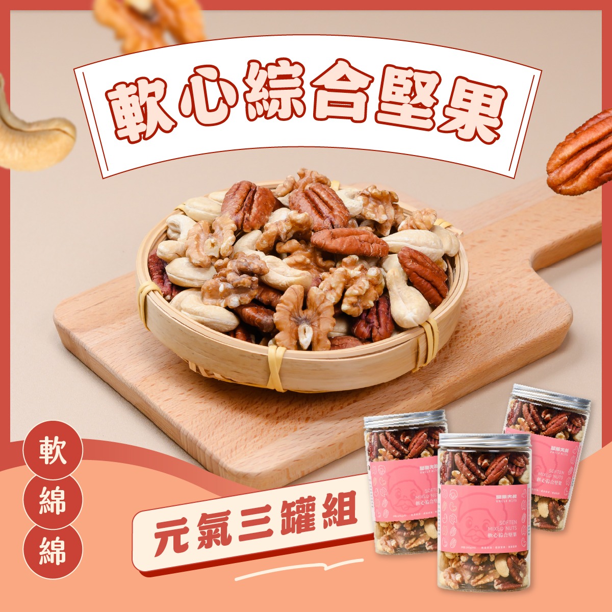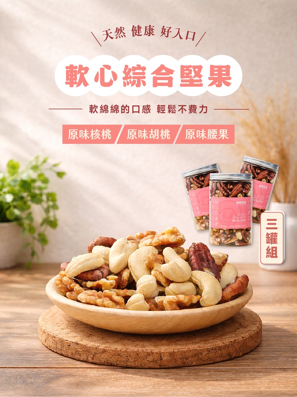 ✓ 嚴選核桃仁、胡桃仁、腰果,口感柔軟不乾硬✓ 軟化處理,好咬好入口,長輩也能安心享用✓ 不用擔心牙口問題,輕鬆補充堅果營養✓ 成份單純無化學添加物,天天吃也無負擔✓ 一天一把,補充堅果中的好油脂與營養素✓ 低溫烘焙+軟心製程,保留堅果原始香氣✓ 吃得到香氣、吃得下去,更吃得安心