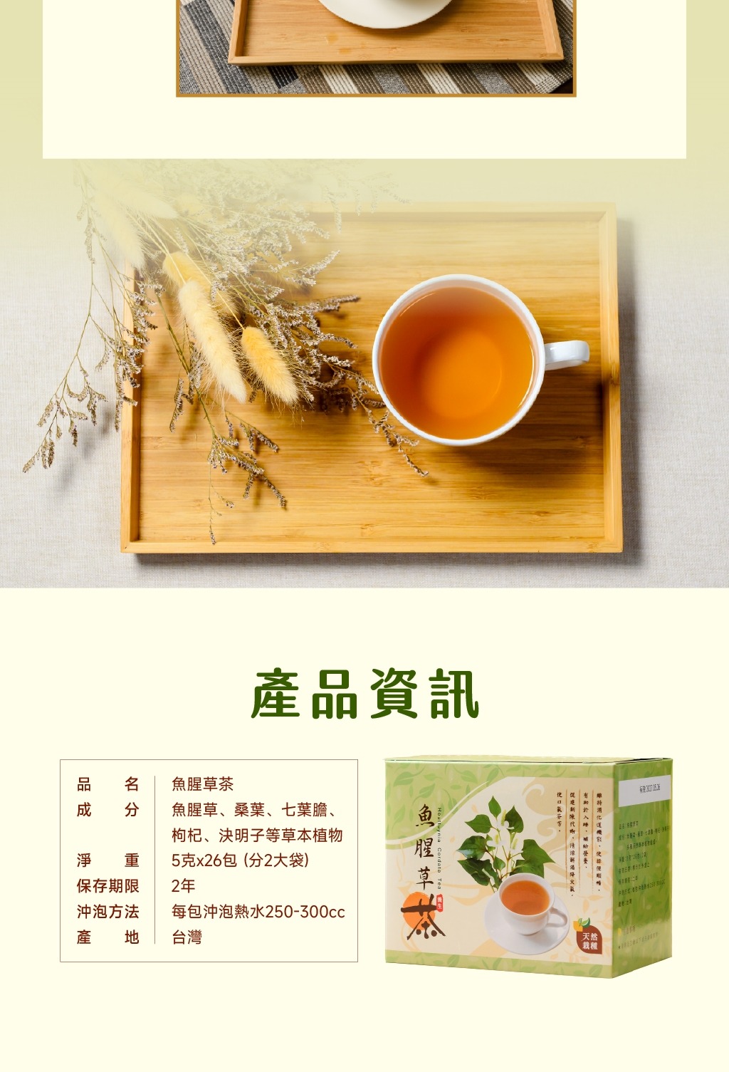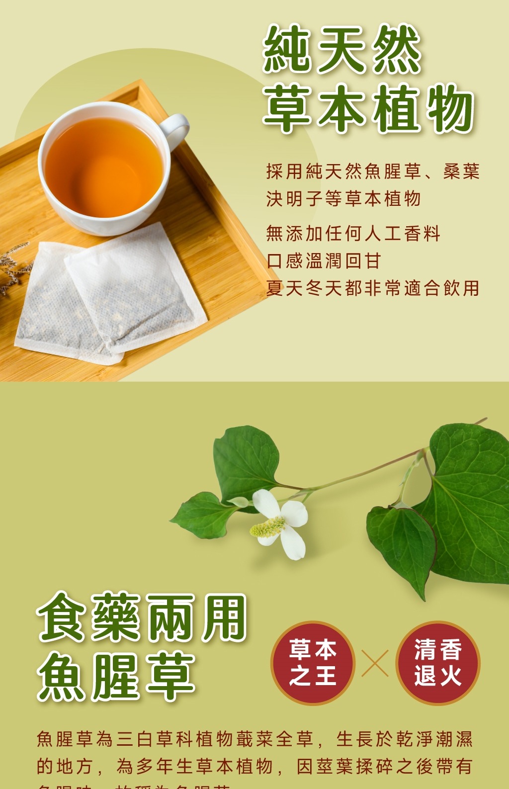 ✓ 百分之百台灣生產 ✓ 草本之王魚腥草 ✓ 調整體質 提升保護力 ✓ 純天然草本植物 ✓ 最佳天然保養飲品 ✓ 獨立茶包 沖泡方便 ✓ 無添加人工香料